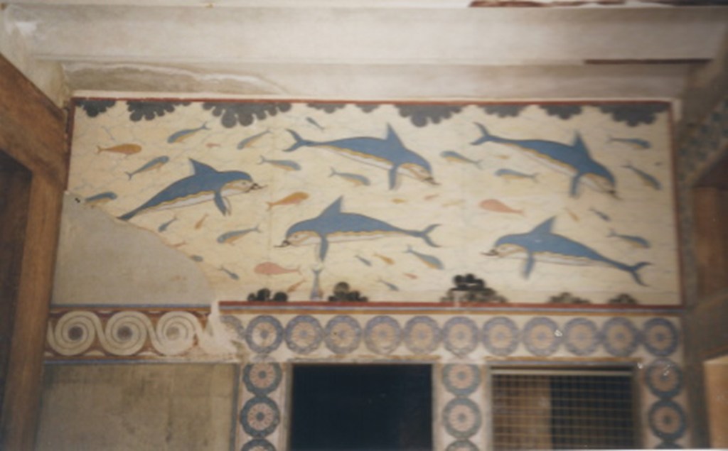 Knossos ligt op een heuvel en valt op het eerste gezicht wat tegen. Je moet even de tijd nemen en wat rondlopen voor je de details ontdekt: een mooie rode pilaar, een aantal in goede staat verkerende amforen en natuurlijk de fresco’s. Helaas mag je niet overal naar binnen en moet je met name de fresco’s (o.a. de beroemde dolfijnen) van een afstandje bekijken, met een bus Duitsers in je rug. Na anderhalf uur heb ik het wel gezien. Het is niet al te groot, vergelijkbaar – in meerdere opzichten trouwens – met het Forum Romanum in Rome.