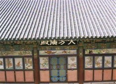 Het tempelcomplex is erg groot, zo groot dat ik niet goed weet waar ik moet beginnen. In de boeddhistisch boekwinkel op het terrein koop ik daarom maar eerst een Engelse gids. Ik vind een lekker plekje tussen de tempels en lees me eerst maar eens in in de betekenis van Haein-sa. Daardoor begint het veel meer te leven, en besef ik hoe mooi het hier eigenlijk is. De hoofdgebouwen zijn rood, met blauw/groene versieringen. Zowel aan de binnen- als buitenzijde zijn er bonte muurschilderingen. Het schouwspel wordt gecompleteerd door de donkere bossen en de pieken van de bergen op de achtergrond.