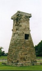 Snel maar weer verder. Nou ja, snel: het is erg warm en benauwd buiten, veel erger dan de voorafgaande dagen. Een paar niet al te interessant uitziende bezienswaardigheden laat ik daarom links liggen, en ik loop meteen door naar de Cheomseomgdae uitkijktoren. De foto van dit markante, sierlijke gebouw siert zo ongeveer elk verhaal over Gyeongju. Het ding stamt uit de zevende eeuw, en heeft 12 stenen als basis (het aantal maanden in een jaar). Het bestaat verder uit 30 lagen (dagen in een maand), en in totaal zijn er 360 stenen gebruikt (aantal dagen in een jaar, zo ongeveer).