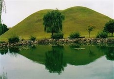 Vanaf de eenzame toren gaat het verder naar het Tumuli park waar 20 graftombes zijn van de Shilla-koningen. Eerst nog maar een ijskoude fles water ingeslagen (met klomp ijs), maar gelukkig staan er veel bomen in het park. De grote groene, heuvelachtige graftombes zijn attractie nummer een in Gyeongju. Ook buiten dit park zie je ze overal. Hoewel ze hier nogal toeristisch uitgebuit worden zijn dergelijke grafheuvels bepaald niet uniek voor Korea. Vorig jaar zag ik ze in Zweden (besneeuwd en wel), en ze zijn er vast op nog wel meer plaatsen. Wel leuk is dat ze er hier ter lering en vermaak eentje als het ware doormidden hebben gesneden. Zo kun je zien hoe het er van binnen uitziet: erg veel stenen, met helemaal onderin een vrij normaal graf van een koning (met gouden sieraden).