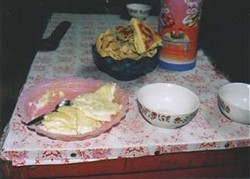 In de loop van de middag gaan we op bezoek bij een nomadenfamilie in de buurt van het kamp. Er is alleen een vrouw met haar dochtertje thuis. Haar man, die jager is, is de andere kinderen naar school brengen in de stad: op 1 september beginnen de scholen weer. Eerst krijgen we zoute thee te drinken met veel melk. Het gezin heeft een kudde koeien, dus daar kunnen we wat produkten van proeven. De yoghurt bijvoorbeeld is prima. Erg lekker is ook een soort boter/kaas-achtig iets om op brood te smeren (öröm, een soort St. Moret). Ook probeer ik nog de keiharde, gedroogde aaruul (een favoriete snack).