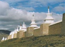 Daarna rijden we door naar Karakorum, de voormalige hoofdstad van het rijk van Genghis Khan. We bezoeken er eerst Erdene Zuu, het grote klooster. Dit is wellicht Mongolië’s grootste toeristenattractie, en we zijn dan ook niet de enige bezoekers hier. De kloostergebouwen worden omringd door een muur van 108 witte stupa’s: het meest kenmerkende aan dit klooster. We kijken ook nog bij een aantal gebouwen binnen. Slechts een klein gedeelte is nog daadwerkelijk als klooster in gebruik, de rest is museum.