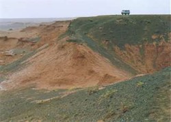 We gaan verder naar Bayanzag. Het vlakke landschap verandert opeens in een soort Grand Canyon. In de prehistorie was hier een groot meer, nu is er alleen nog een rotslandschap met veel rood zand. Er zijn hier veel overblijfselen van dinosauriërs gevonden. Wij gaan ook een tijdje zoeken. Er liggen veel (stukken van) botten, maar de meeste zullen wel van dode kamelen zijn. Het is een heerlijke omgeving om door rond te struinen, ondanks de aanhoudende regen. Hier en daar komen er kleine bloemetjes uit de rotsen en het zand tevoorschijn. Ook liggen er veel glimmende stenen in rood, turquoise en groen.