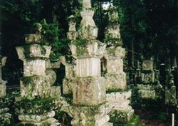 Na het ontbijt (een kleinere versie van het avondeten) wandel ik naar Okunoin. In deze tempel ligt het lichaam van Kobo-Daishi, de grondlegger van het Shingon-Boeddhisme. De route er naar toe loopt door een donker bos waar een enorme begraafplaats is, met veel grote verweerde beelden en stenen.