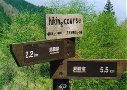 Om negen uur de volgende ochtend stap ik in de bus naar Magome, vanwaar ik mijn wandeling over de oude postroute wil starten. Mijn spullen laat ik achter in een bagagekluisje op het busstation van Tsumago. Het is maar een half uurtje rijden naar Magome, een kleinere versie van Tsumago. De zon is er al goed aan het branden, dus maar snel op pad. Het eerste stuk is flink klimmen, naar de Magome pas. De route is hier weinig beschut en loopt door dorpjes. Af en toe tref ik een andere wandelaar: het is een bekende route die ik volg, een die zelfs in het Engels goed staat aangegeven.