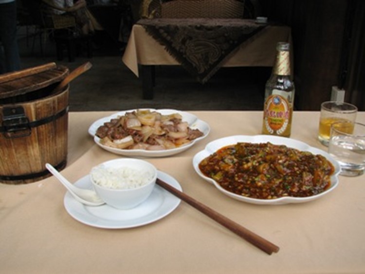 Aan de Beihuan Zonglu (eerste grote weg links vanaf de Longzhong Lu) liggen verschillende restaurantjes. Ze zien er allemaal een beetje hetzelfde uit: ronde tafels, zwarte houten stoelen en wat serveerstertjes bij de voordeur om klanten te lokken. Bij een ervan at ik gedroogd rundvlees, tomaat/ei en aardappelsliertjes.
