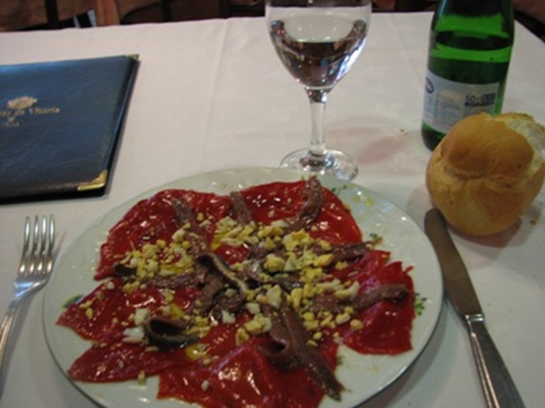 Van tevoren wist ik eigenlijk al wat ik wilde gaan eten. In ieder geval iets met vis, en natuurlijk ook mijn grote favoriet: inktvis. Vooraf neem ik rode paprika met ansjovis. Er zit een sausje van olie en ei over. Het is een koud gerecht, het smaakt bijna als een soort salade.