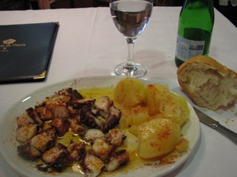 Mijn hoofdgerecht is Pulpo a la Gallega: octopus bereid op Galicische wijze, het streekgerecht van de naburige provincie Galicië. Het bestaat uit gekookte stukjes inktvis met paprikapoeder in een dressing van olie/limoen/zout. Heerlijk!