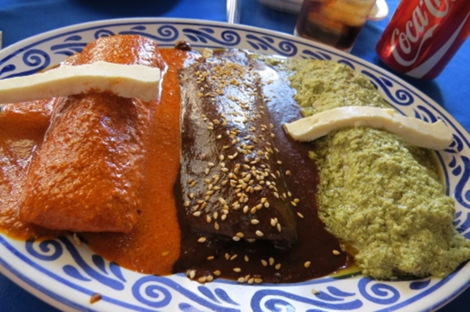 Opvallend: Puebla staat in Mexico ook bekend om zijn keuken. De mole poblano (“saus uit Puebla”) is hier uitgevonden door een stel nonnen die zo de legende wil snel iets klaar moesten maken voor een bezoekende aartsbisschop en het moesten doen met de ingrediënten die ze toevallig in huis hadden. Dat leidde tot deze typische donkerbruine saus waarin o.a. rode pepers en chocolade zijn vermengd. Ik at hem in een van de bekendste restaurants van Puebla, Fonda de Santa Clara. De saus bedekte enchiladas gevuld met kip, en daarnaast waren er nog twee andere smaken te proeven: de rode en groene pipian-saus, gemaakt van geroosterde pompoenzaden. Het was heerlijk!
