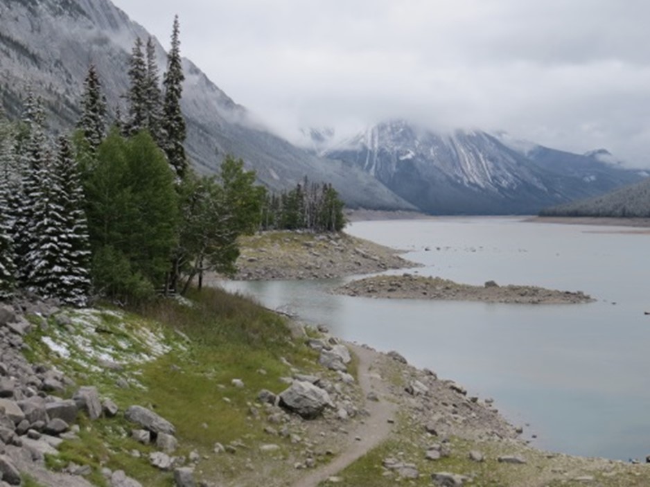Iets voor Maligne Lake ligt een ander groot meer, Medicine Lake. Deze ziet er juist met een laagje sneeuw tegen de grijze rotsen wel aantrekkelijk uit. Er scharrelt ook nog een pika, het mini-haasje dat ik twee dagen geleden op mijn wandeling naar de Stanley-gletsjer ook heb gezien.