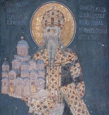 In de kerk zelf was één non druk bezig met het poetsen van het houtwerk van de banken. Ze keek niet op of om. Het is nog echt een actief klooster, en ze hebben geen concessies gedaan om het bezoekende toeristen duidelijker te maken waar je naar staat te kijken. Ik genoot er maar van als kunst: de muurschilderingen zijn prachtig, en bedekken zelfs de binnenkant van de hoogste koepel. Van de buitenkant lijkt de kerk niet zo groot, maar hij is wel heel hoog. Erg indrukwekkend. Binnen mag je dus geen foto’s maken, daarom hieronder maar een afbeelding van één van de muurschilderingen in Gracanica die ik rechtenvrij op het internet vond.