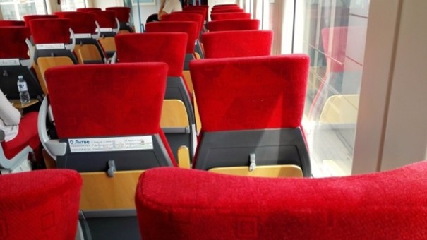 Tussen Vilnius en Minsk ging ik met de trein. Deze was tot op de laatste plaats gevuld, dus het was maar goed dat ik hier 2 weken van tevoren geboekt had. Destijds waren er op de website van de Wit-Russische spoorwegen nog maar 12 plaatsen over. Het blijkt dat deze trein veel gebruikt wordt door Wit-Russen die van vakantie terugkomen: ze vertrekken liever van het vliegveld van Vilnius dan uit Minsk, omdat er meer vluchten zijn naar Europese vakantiebestemmingen en het goedkoper is. Het is een moderne trein, alleen wat krapjes voor een lange treinrit (het is meer het type Sprinter zoals we dat in Nederland kennen). De reis kostte 16 EUR.