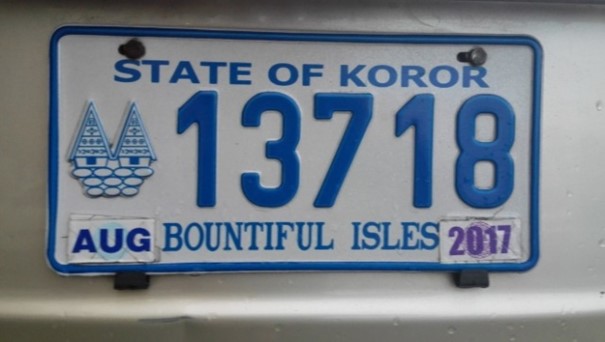 Voor mijn eerste volle dag op Palau heb ik een auto gehuurd. Ik krijg een Toyota Corolla mee, waarvan het stuur rechts zit (terwijl ze hier ook rechts rijden). De auto’s zijn blijkbaar geïmporteerd uit het linksrijdende Japan. Het is nog een hele tour om de toeristenplaats Koror uit te komen, zo druk is het (vakantie)verkeer. Maar eenmaal over de brug naar Babeldaob wordt het een stuk rustiger. Ik rijd door een weelderig groen landschap opgesierd door grote rode en witte bloemen. Het heeft ’s ochtends een beetje geregend, en zo aan de begroeiing te zien regent het hier vaak genoeg.