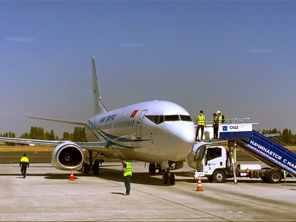 Van Osh vloog ik terug naar Bishkek. De vlucht duurt maar 3 kwartier. Het vliegtuig van de Kirgizische maatschappij Avia Traffic zat bijna helemaal vol. We kregen onderweg een bekertje water. Met name vlak voor Bishkek heb je een mooi zicht op de besneeuwde bergtoppen.