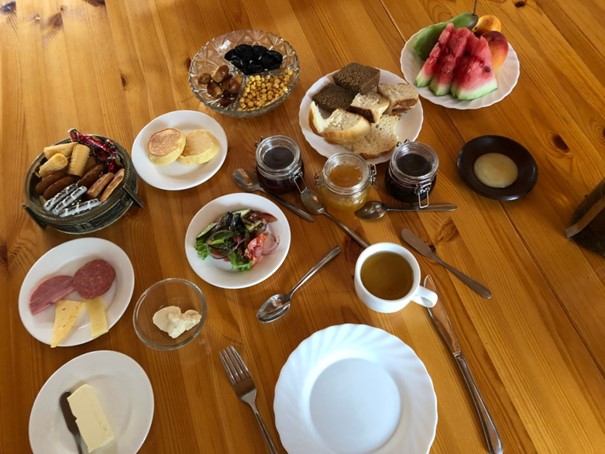 Het ontbijt was voor mij de beste maaltijd van de dag. Ze hebben in Kirgizië heerlijk vers brood. Ook krijg je er meestal zelfgemaakte jam en honing bij. In de homestay in Arkit hadden ze geweldige frambozenjam, we bleven ervan eten: op brood, door de rijstepap of zomaar met een lepeltje.