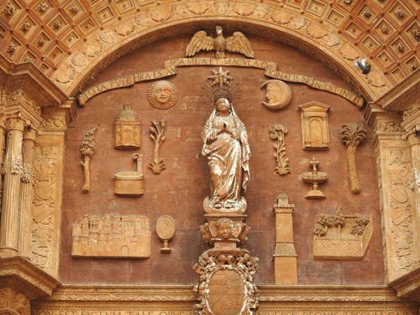Ik loop er eerst rustig een rondje omheen. De stenen heb een warme oranje-rode gloed, zelfs nu er alleen maar een waterig zonnetje schijnt. Er zijn twee gebeeldhouwde portalen die de aandacht trekken. Ze zijn in de 16de eeuw aan het gebouw toegevoegd in een plateresco stijl (“op de wijze van de zilversmid”) – simpelweg heel verfijnd en delicaat. Je blijft kijken naar wat er allemaal afgebeeld is.