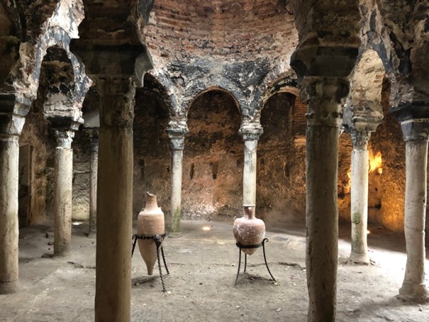 In het badhuis zijn Romeinse en Byzantijnse elementen hergebruikt. Het mooiste deel is het tepidarium, het centrale deel waar het lauw-warme bad was en er volop gesocialized werd. Daglicht valt er naar binnen door 25 openingen in het halfronde plafond. Hierna loop je de tuin in, een kleine oase met palm- en sinaasappelbomen in het hart van de binnenstad van Palma.