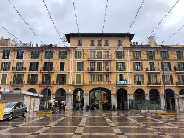 Helaas is het stilaan steeds harder beginnen te regenen. Er zijn gelukkig genoeg portieken in Palma om onder te schuilen, maar een lange wandeling naar het Castell de Bellver zie ik niet meer zitten. Ik steek nog snel de Plaza Mayor over, het centrale plein dat niet meer zo’n grootse uitstraling heeft door de vele goedkope eettentjes die er zijn neergezet.