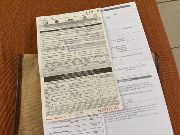 Voor de grensovergang met Belize hadden we vooraf 4 uitgebreide formulieren gekregen om in te vullen. Gelukkig hadden ze net per 1 maart de meeste Coronamaatregelen afgeschaft, zodat alleen de entry card werd gebruikt. Ook moet je hier vooraf betalen voor een verplichte verzekering, dat werd wel gecheckt.