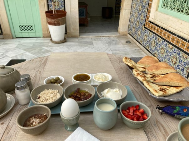 Je begint hier zeker niet met een lege maag aan de dag. Sterker nog, de ontbijten waren telkens zo groots dat je eigenlijk niet meer hoeft te lunchen. Meestal was het een mix van Franse en Tunesische gerechten, van croissants en pain-au-chocolat tot aan vers Tunesisch brood. Vijgenjam, olijventapenade, zelfs wat scherpe harissa op de vroege ochtend. En dan als toetje nog verse aardbeien en yoghurt.