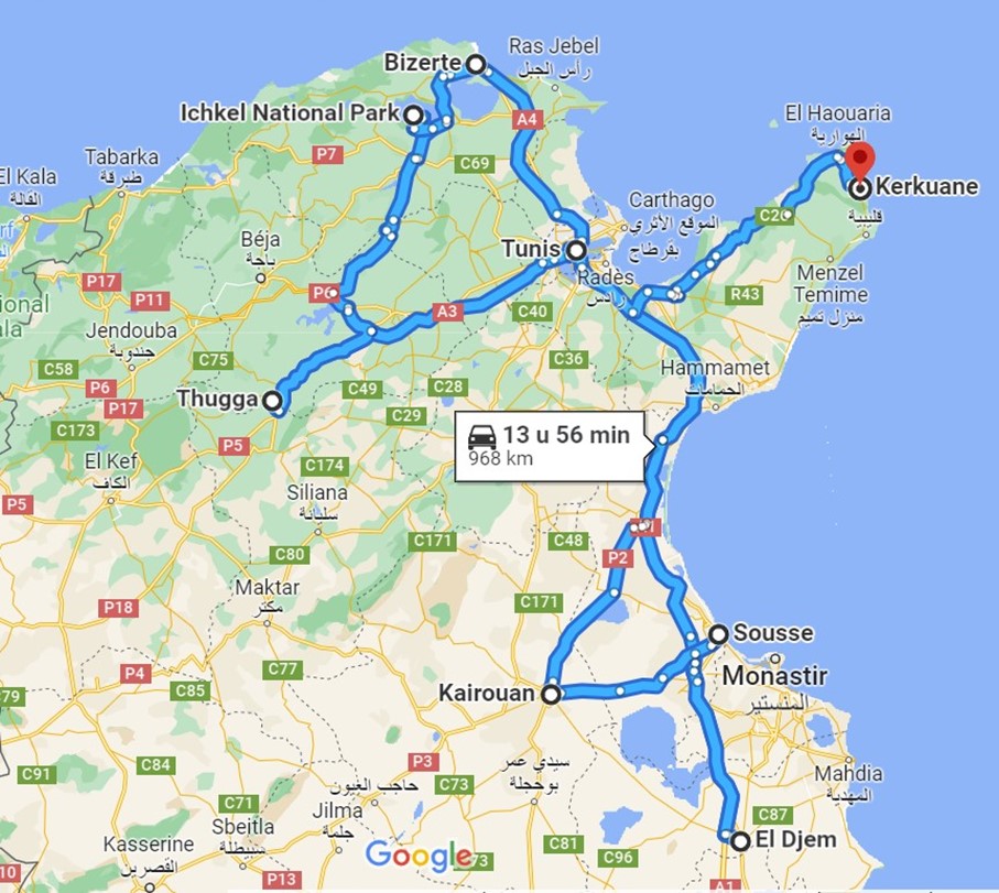 | 18 mei | Rijden naar het noordoosten voor ruïnes van de Punische havenstad Kerkuane (WE8). Aan het einde van de dag terugrijden naar de omgeving van het vliegveld van Tunis. | Tunis |