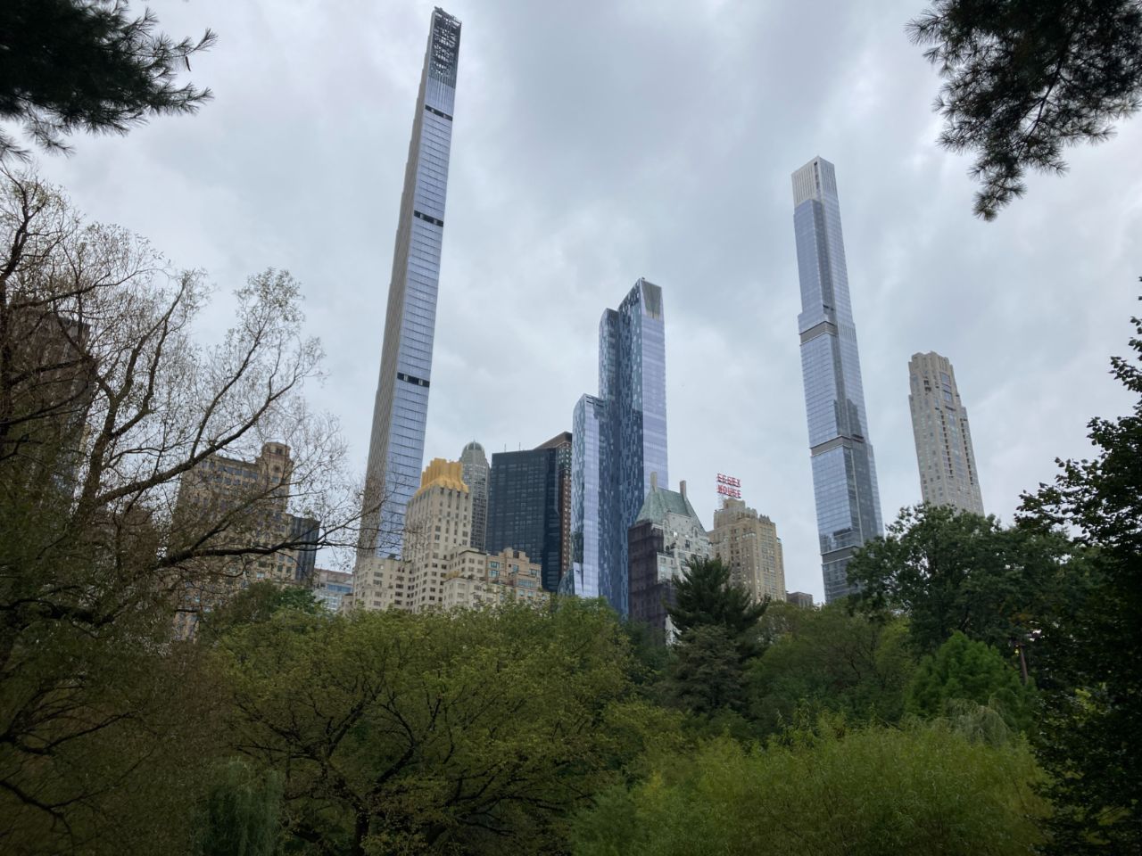 Het is een beetje regenachtig vandaag dus ik doe maar een korte wandeling door het Central Park. Ik loop door het zuidelijke deel en zie het groen en de omringende wolkenkrabbers.