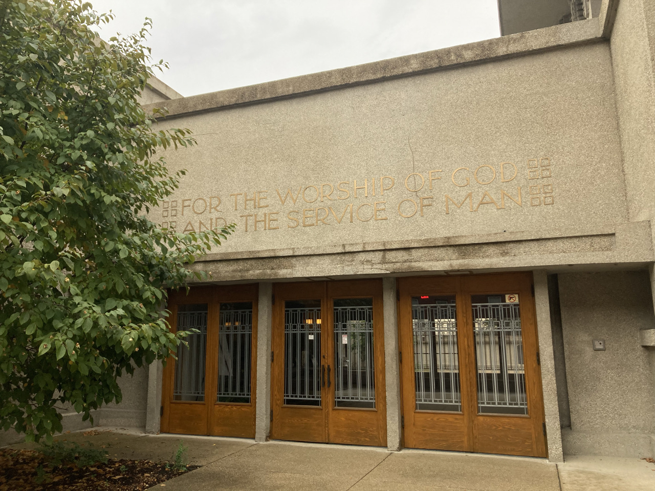 Onze eerste rondleiding van de dag is bij Union Temple. Dit is altijd een actieve kerk geweest, maar het is verre van een traditioneel kerkgebouw. Wright ‘won’ deze opdracht omdat hij in de buurt woonde en een goede bekende was bij de opdrachtgevers. Het dateert uit 1905, dus relatief vroeg in zijn carrière, en bestaat uit twee symmetrische kubussen van gewapend beton. De ene wordt gebruikt voor gemeenschapsgemeenten, de andere voor religieuze diensten.