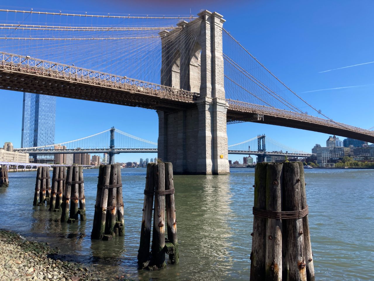Ik neem aan het eind van de ochtend de veerboot weer terug naar Battery Park en ga dan zelf aan de wandel. De Brooklyn Bridge is een gemakkelijke aanvulling op de eilandencruise, omdat de toegang ook in het centrum van Manhattan ligt. Ik loop eerst over de East River Esplanade, waar het uitzicht op de brug steeds beter wordt.
