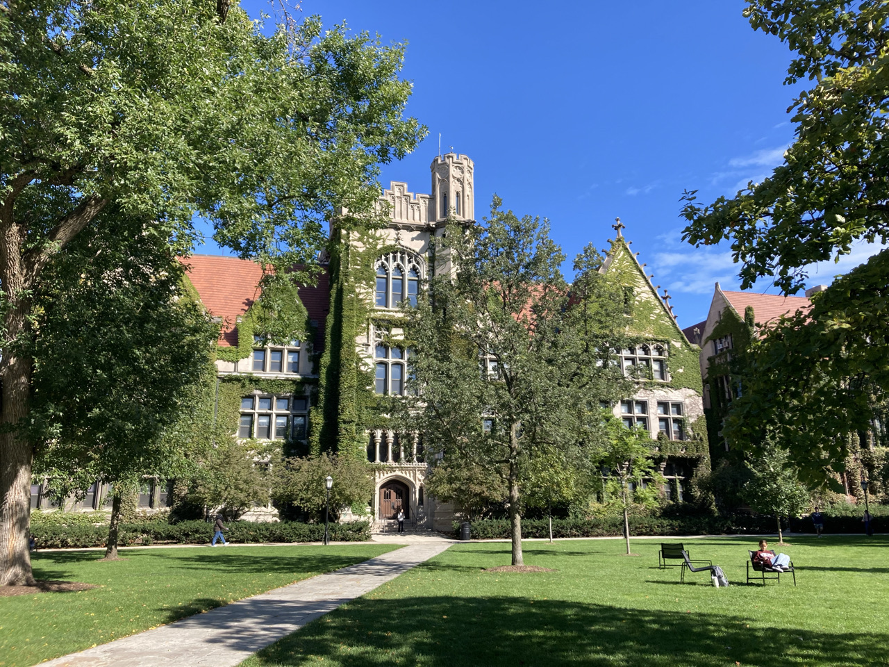 De wandeling naar het Robie House is weer een prettige. Hij gaat voor een groot deel over de campus van de Universiteit van Chicago. Dit is een statig terrein, daterend van eind 19de eeuw en gebouwd alsof het Oxford of Cambridge is.
