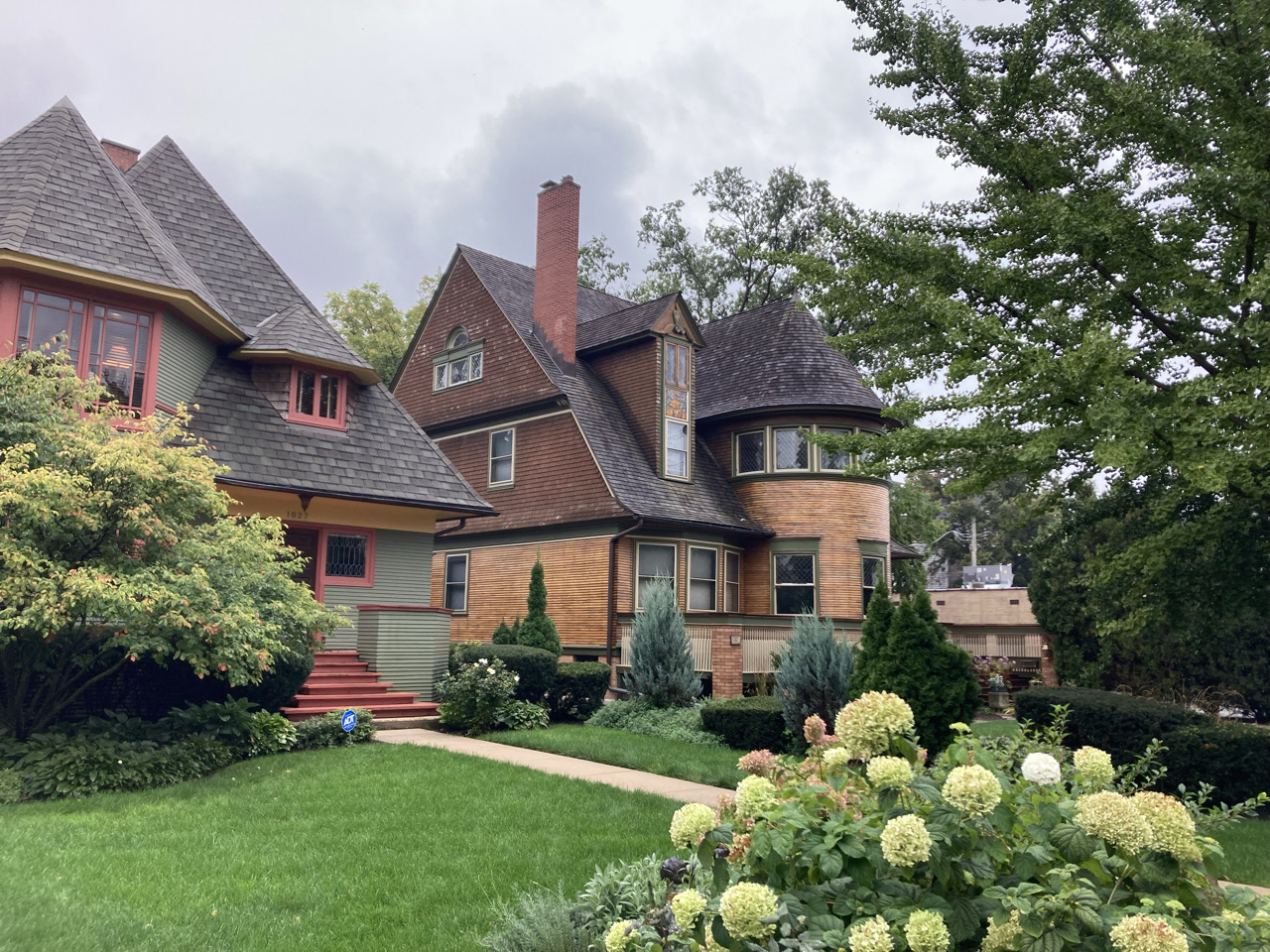Samen met Frederic en Jason begin ik op deze dag 1 van de werelderfgoed-meetup met een wandeling om 8 uur door de wijk Oak Park. Deze mooie woonwijk herbergt talloze gebouwen van Frank Lloyd Wright, waaronder zijn huis en studio. Elke tuin had minstens één eekhoorn, en veel van de historische gebouwen vertoonden Halloween-versieringen.