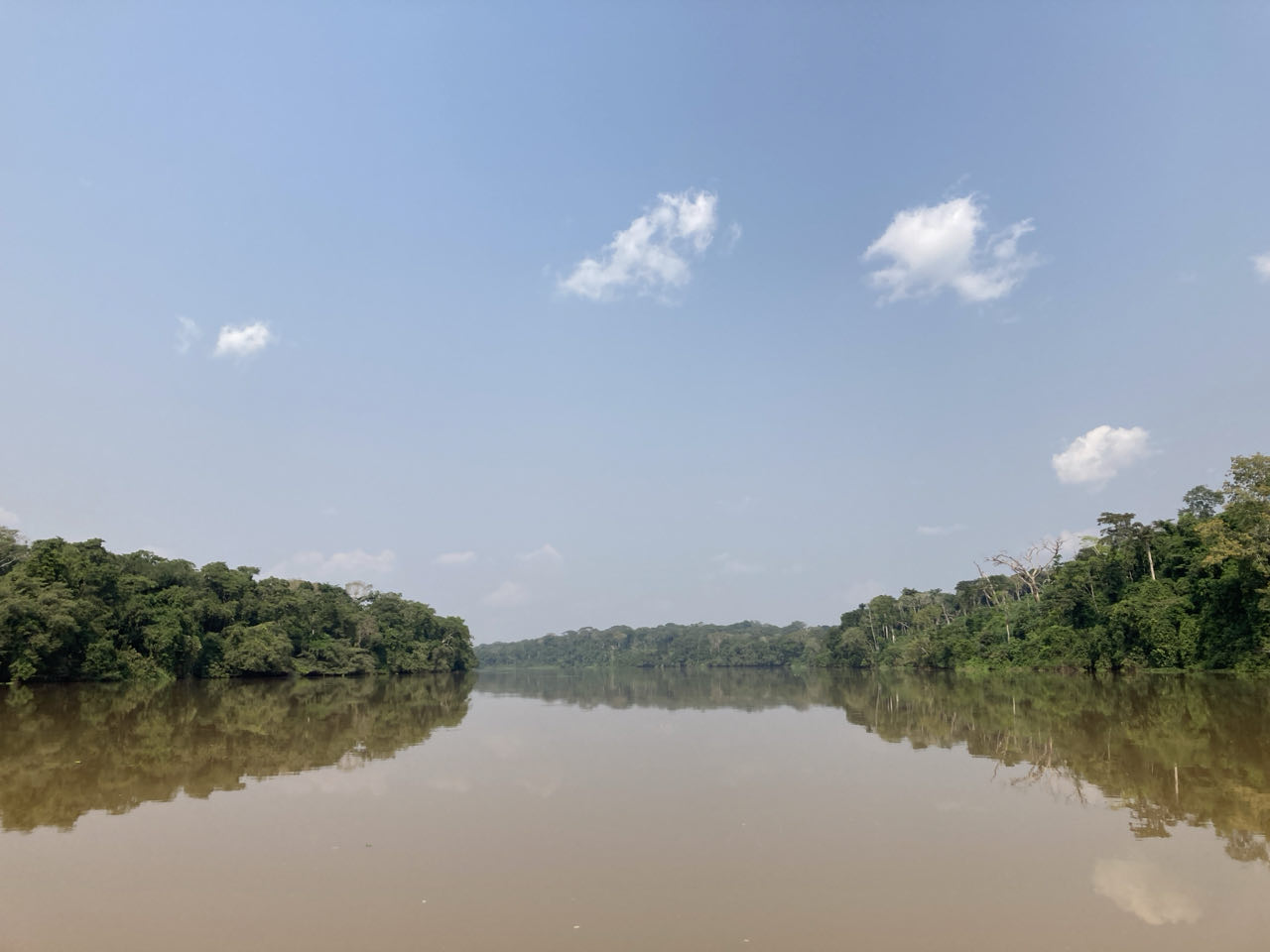 Daarna varen we nog twee uur over de Sangha rivier, waar het rustig is op een enkele visser na. Om half 4 arriveren we bij de lodge. Hier krijg ik een ruime kamer met veranda en gedeelde badkamer. En met uitzicht op de rivier.