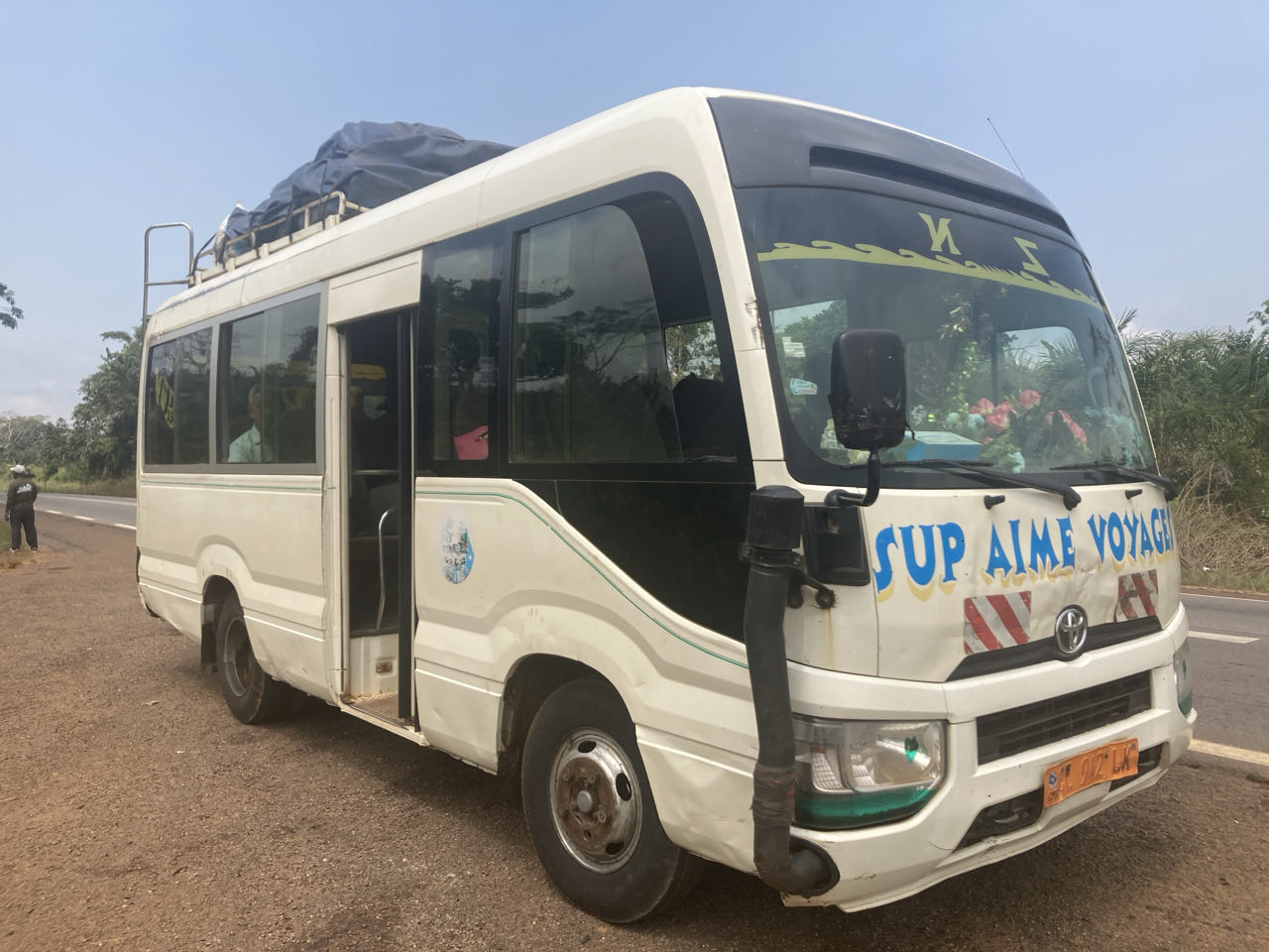 De bus staat al klaar aan de andere kant van de rivier, in Kameroen. Ik bemachtig een plekje voor in de bus. Het is er veel minder stoffig dan achterin en ook minder benauwd.
