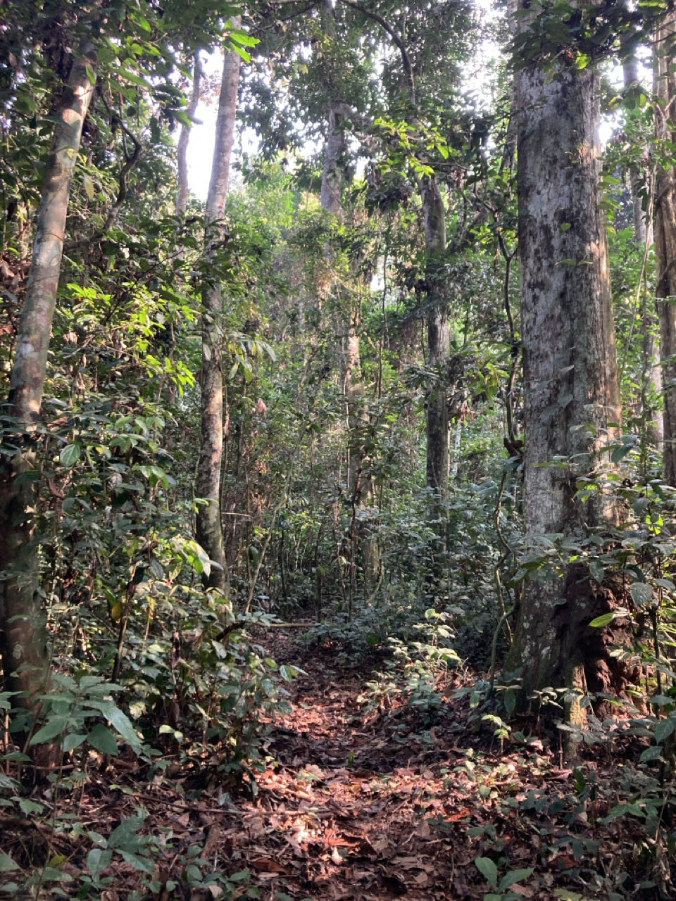 Het is een fijne boswandeling van zo’n 3km. Het pad is breed en met een simpel kaartje van de lodge vind je de weg wel. Het meest aanwezig zijn de neushoornvogels, die maken zoveel lawaai. Ik zie twee apen in een verre boom, te ver om te zien welke soort het is.