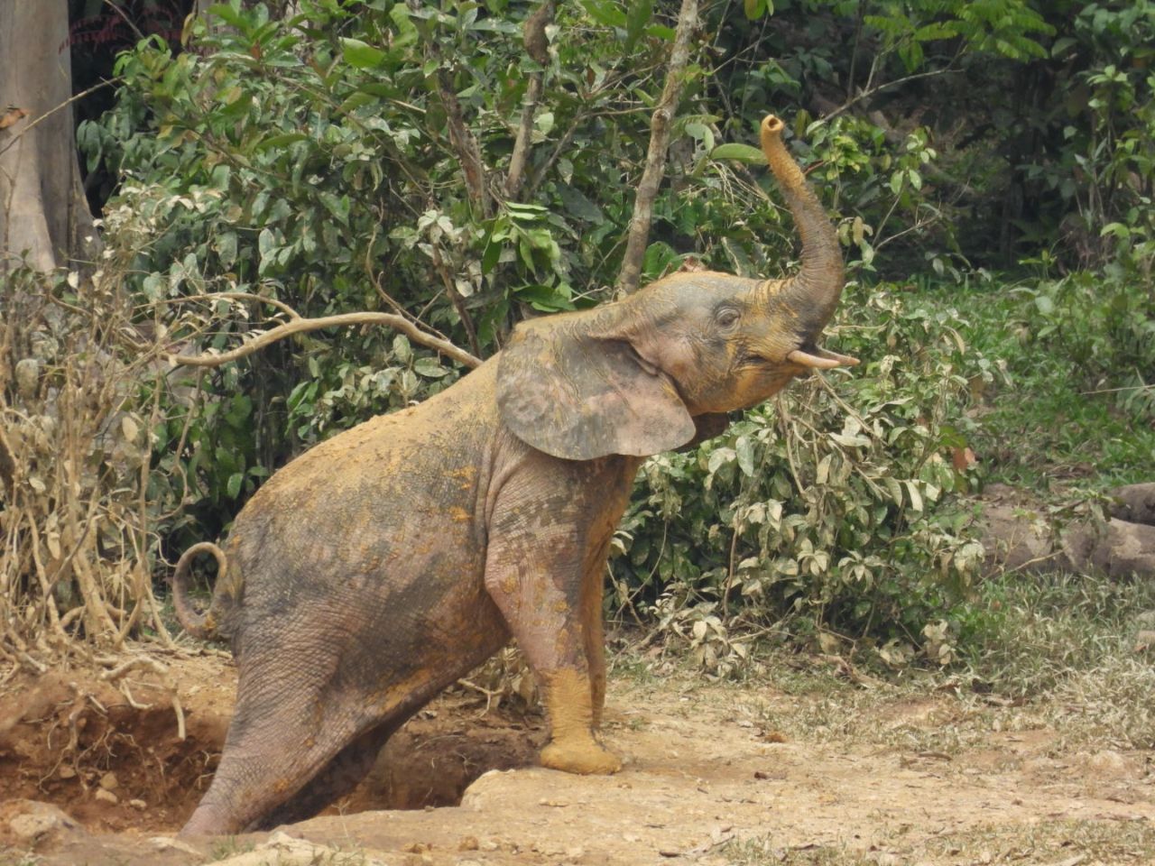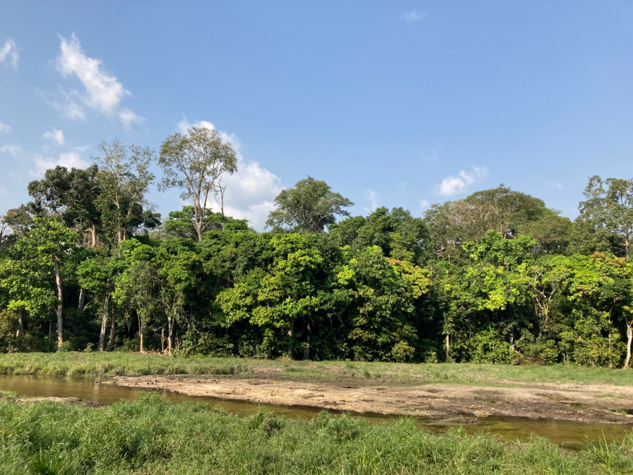 In de bai moet je weer een watertje oversteken (ik neem niet eens de moeite mijn schoenen uit te trekken), maar daarna is het een vlakke boswandeling. De locale trackers ‘glijden’ als het ware door het bos, waar de grotere gestaltes van de toeristen toch vaak in de takken verzeild raken.