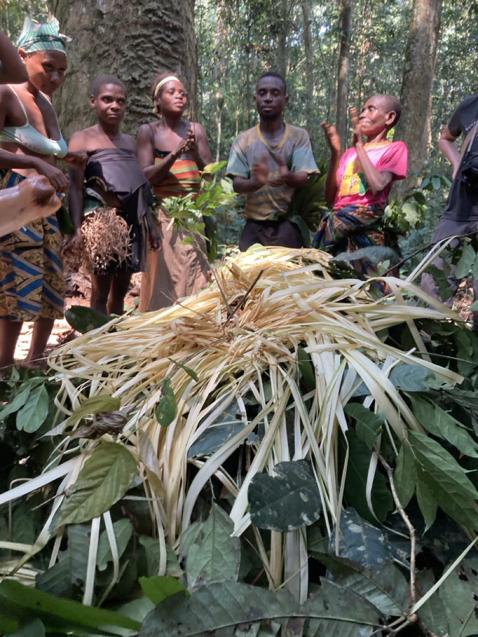 In een open ruimte in het bos staan een stuk of 10 hutten van bladeren. We moeten ons eerst melden bij de chief (getooid met een verentooi), die bekijkt of we welkom zijn. Hij heeft een eigen vertaler, onze lokale gids kan hem niet verstaan. Daarna gaan de vrouwen een dans opvoeren, samen met een karakter getooid als een bewegende struik die de bosgeest Ejengi verbeeldt. Ze hebben een soort receptiehut, waar de chief nog wat trucjes opvoert.