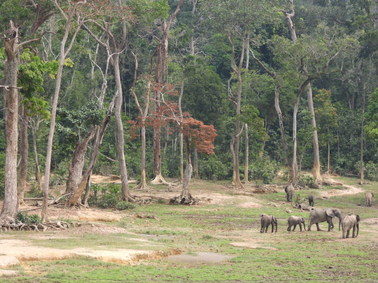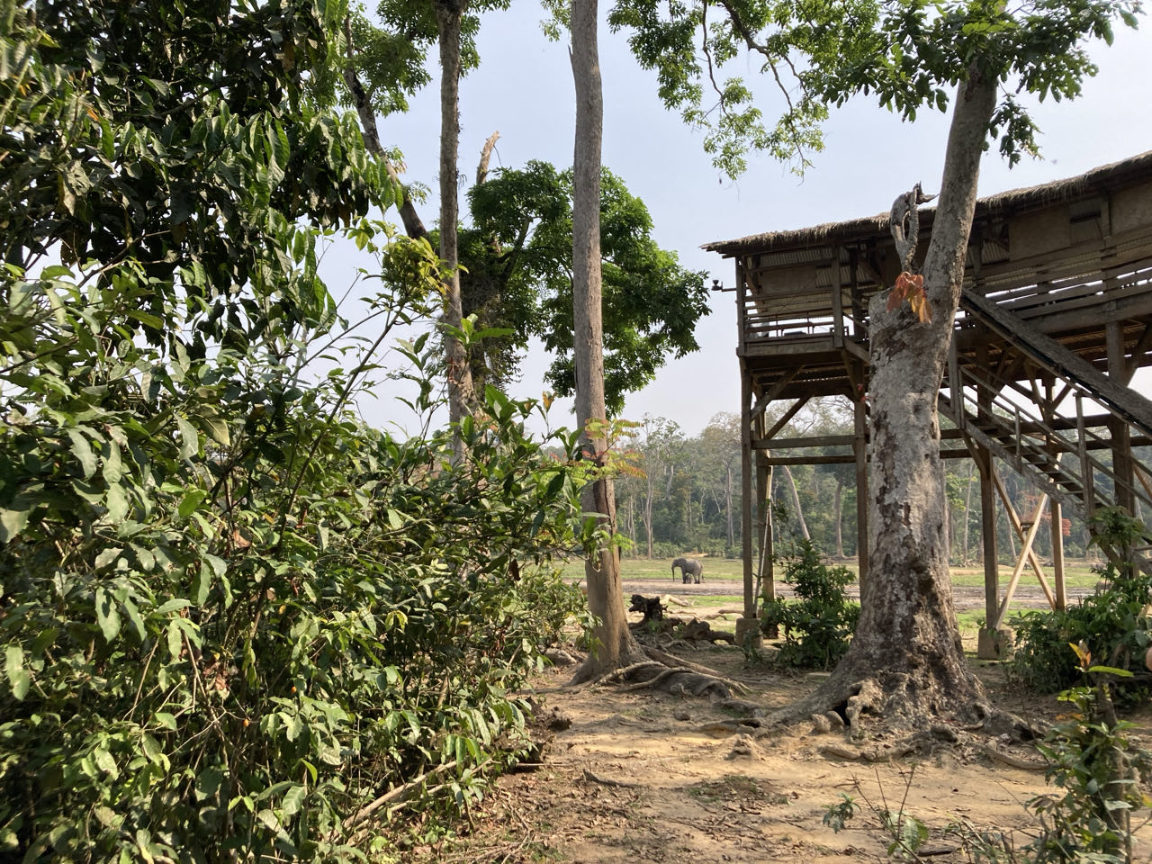 Daarna lopen we nog 45 minuten door het bos. Het is een vrij gemakkelijk pad. Als het licht begint te worden (minder bomen) en we olifanten horen, komen we aan bij de houten uitkijktoren vanwaar we neerkijken op Dzanga Bai. Er staan stoelen, we hebben lunch mee en het is overdekt tegen de zon, dus je houdt het hier wel een paar uur uit. Er zijn wel irritante steekvliegen.