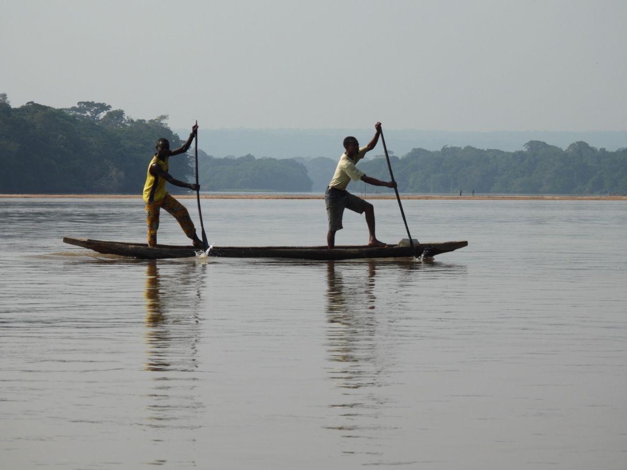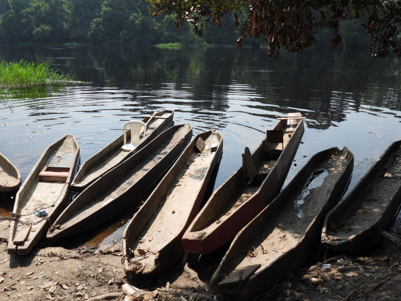 Om 12.30 rijden we door naar het dorp Bela, waar onze boot naar Sangha Lodge in de Centraalafrikaanse Republiek al ligt te wachten. Aan de overkant van de rivier haalt de gids visastempels voor ons in de paspoorten. Het kost een minuut of 20.