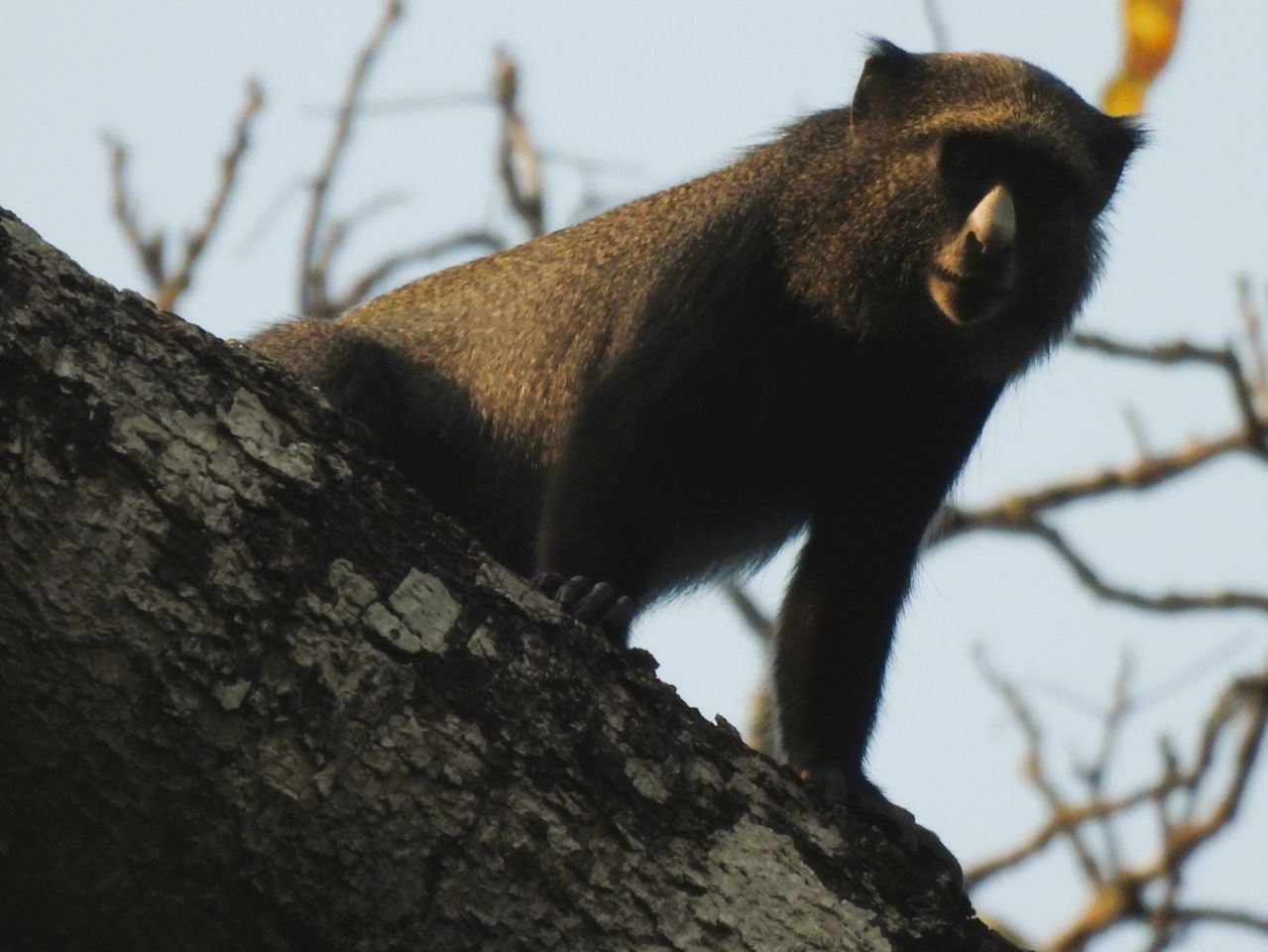Als de zon weer aan het zakken is maak ik nogmaals dezelfde wandeling als vanochtend, maar dan andersom. Halverwege hoor ik alarmgeroep uit de bomen – het blijken 3 grote witneusmeerkatten te zijn, zittend op een kale boomtak. Ze hebben mij gezien en zijn er niet blij mee. Ik wel en ik weet een aantal goede foto’s te maken.