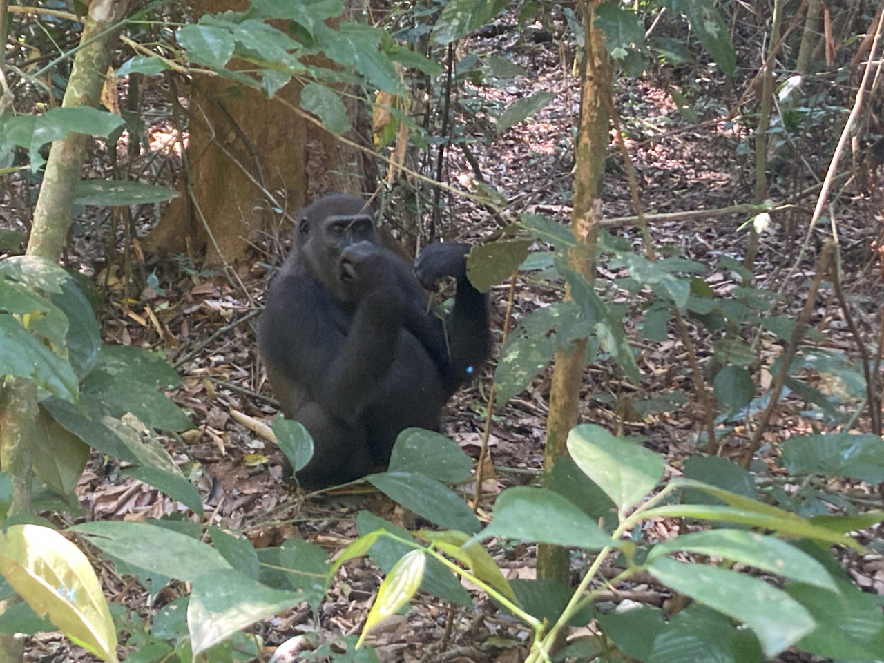 De gorilla’s maken het ons niet gemakkelijk, zeker niet in het begin waarin ze diep tussen de bladeren verscholen zitten en ons steeds de rug toekeren. Na een half uurtje gaat het beter en gaan er twee rustig zitten eten. We zien ook een moeder met een klein jong van een jaar op de rug.