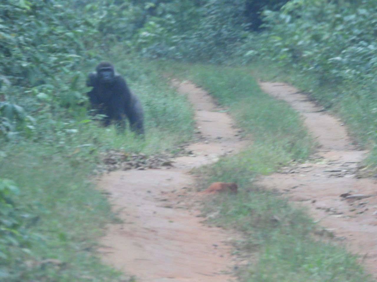 Om 2 uur vangen we de terugtocht aan – dezelfde wandeling en rit als op de heenrit. In het bos weet ik nog een grijswangmangabey te spotten, de eerste apensoort van mijn verlanglijstje van 6 voor deze trip. Voorheen trokken deze op samen met de gorilla’s van Bai Hokou en waren ze gemakkelijk te zien, maar nu moet je ofwel geluk hebben of een aanvullende dagexcursie boeken.