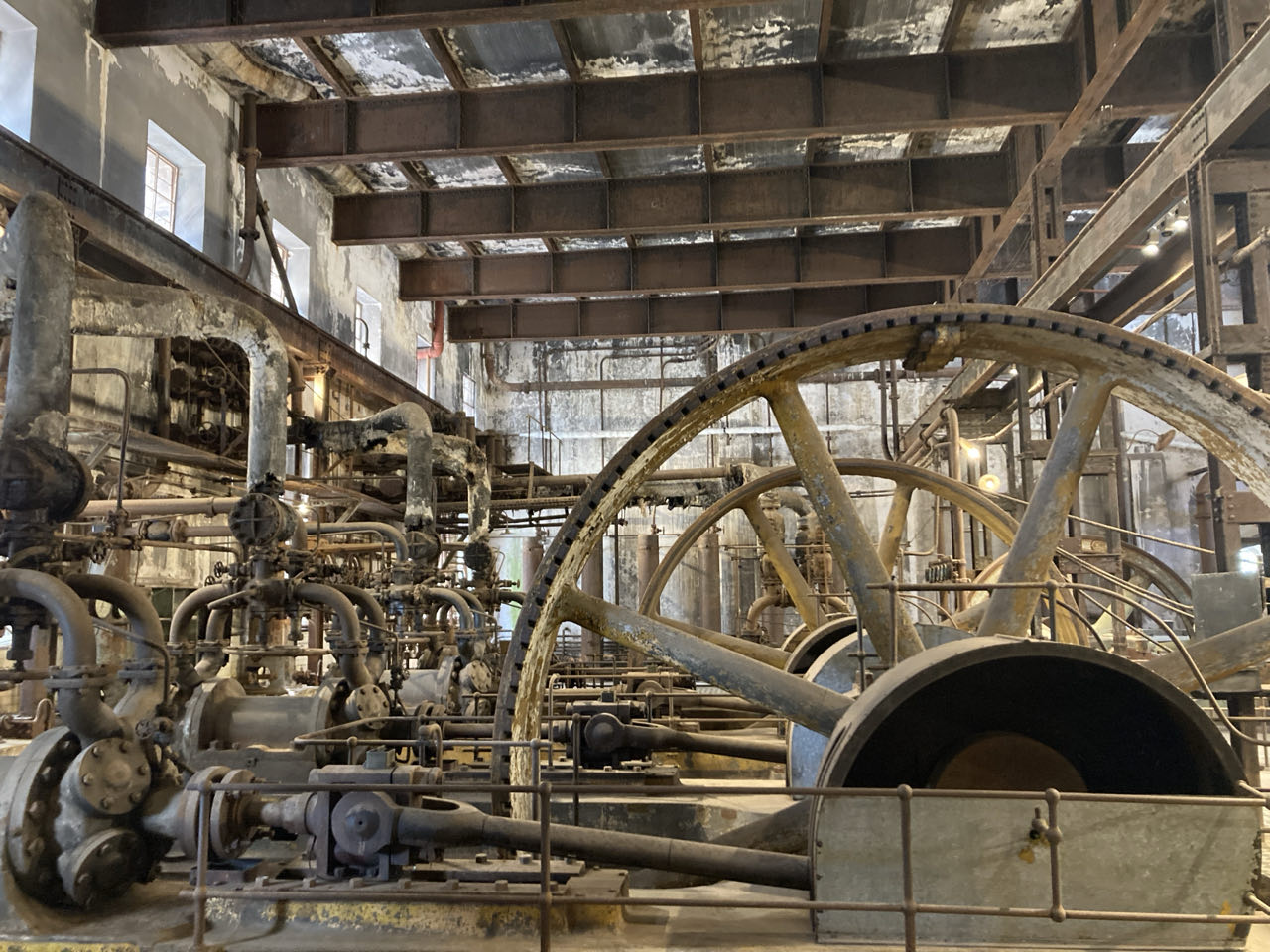 Het bedrijfsterrein is nu een monument. Je kunt het bezoeken met een gids vanaf het museum. Ze verontschuldigen zich hevig dat ze geen Engelse gids beschikbaar hebben, maar ik kan om 3 uur met een Spaanstalige tour mee. De Engelse gids verschijnt toch nog even voordat hij naar huis gaat en laat me de machinekamer zien.