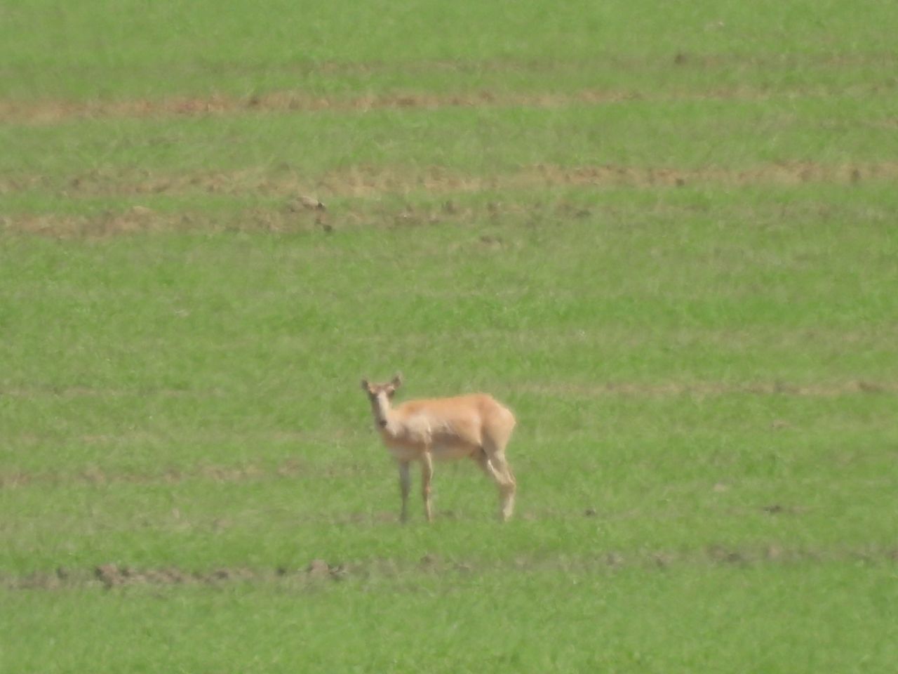 Pas op de laatste plek waar we gaan kijken, buiten het reservaat en vlakbij landbouwgrond, zie ik plotseling in de verte een goudbruin dier van ons wegrennen – wat maar één soort kon zijn: een saiga!