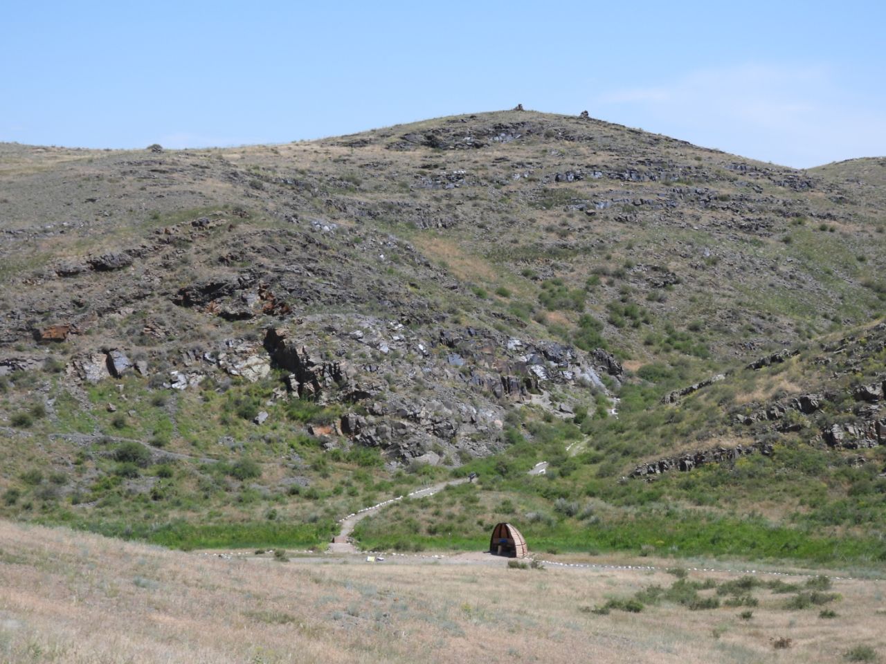 Ongeveer een kilometer verder langs de weg kom je in het omheinde reservaat waar de rotskunst en bijbehorende archeologische vindplaatsen zich bevinden. Er is een grote parkeerplaats en bij de receptie moet je de entreeprijs van 500 tenge (1 euro) betalen. We zijn verrast dat we niet de enige bezoekers zijn – er staat al een grote bus geparkeerd. Hij is van een groep kunststudenten, die voor een wedstrijd ‘en plein air’ op de plek aan het schilderen zijn. We komen ze overal tegen, zittend met hun doeken.