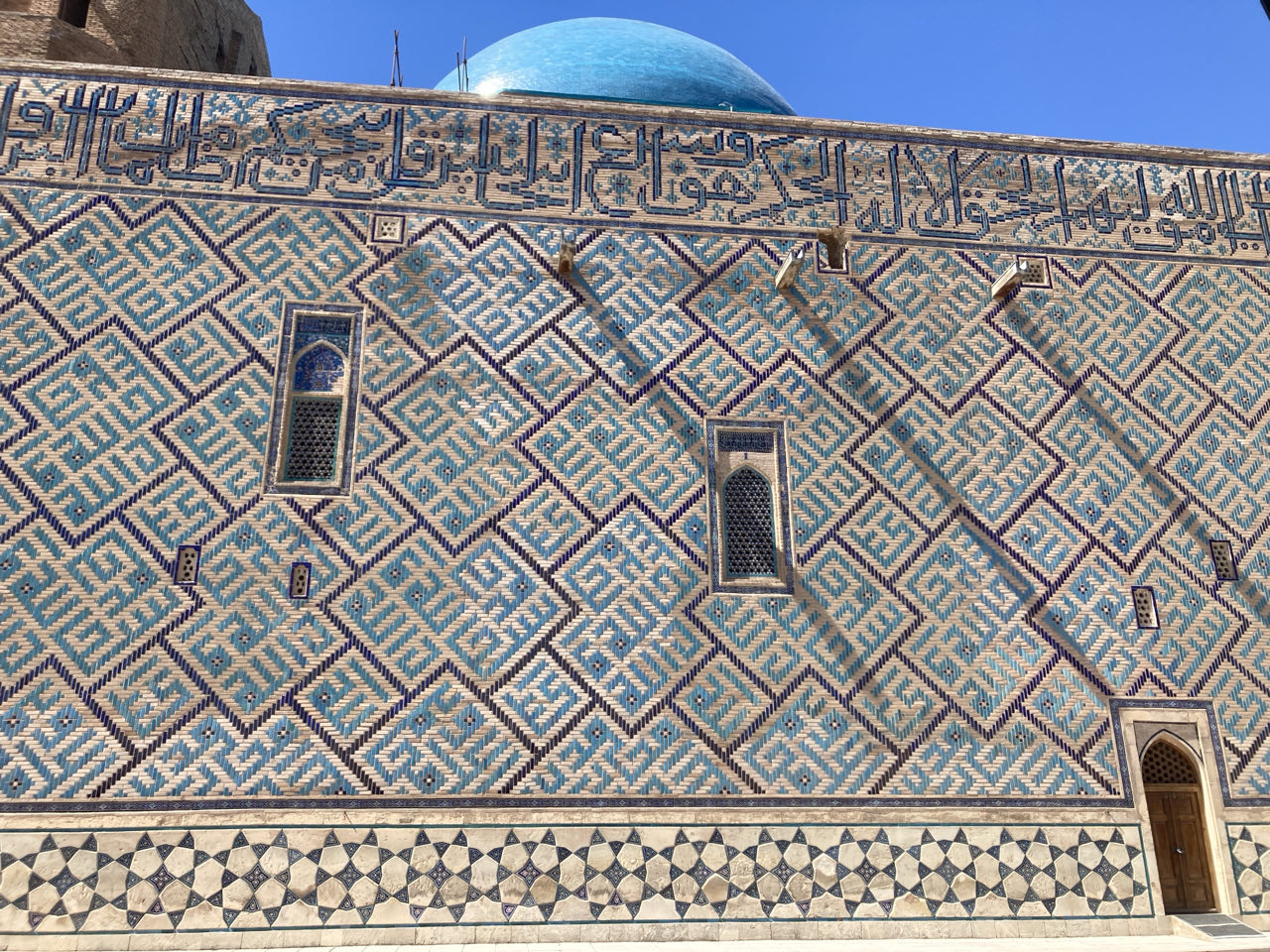 Ik betaal 200 tenge entree voor toegang tot het terrein waar de schitterende tombe van Aisha Bibi ligt (die ernaast is van een van haar volgelingen). Het is een plaatje, en van dichtbij kun je zien de ontelbare uitgesneden motieven zien. Echt prachtig.