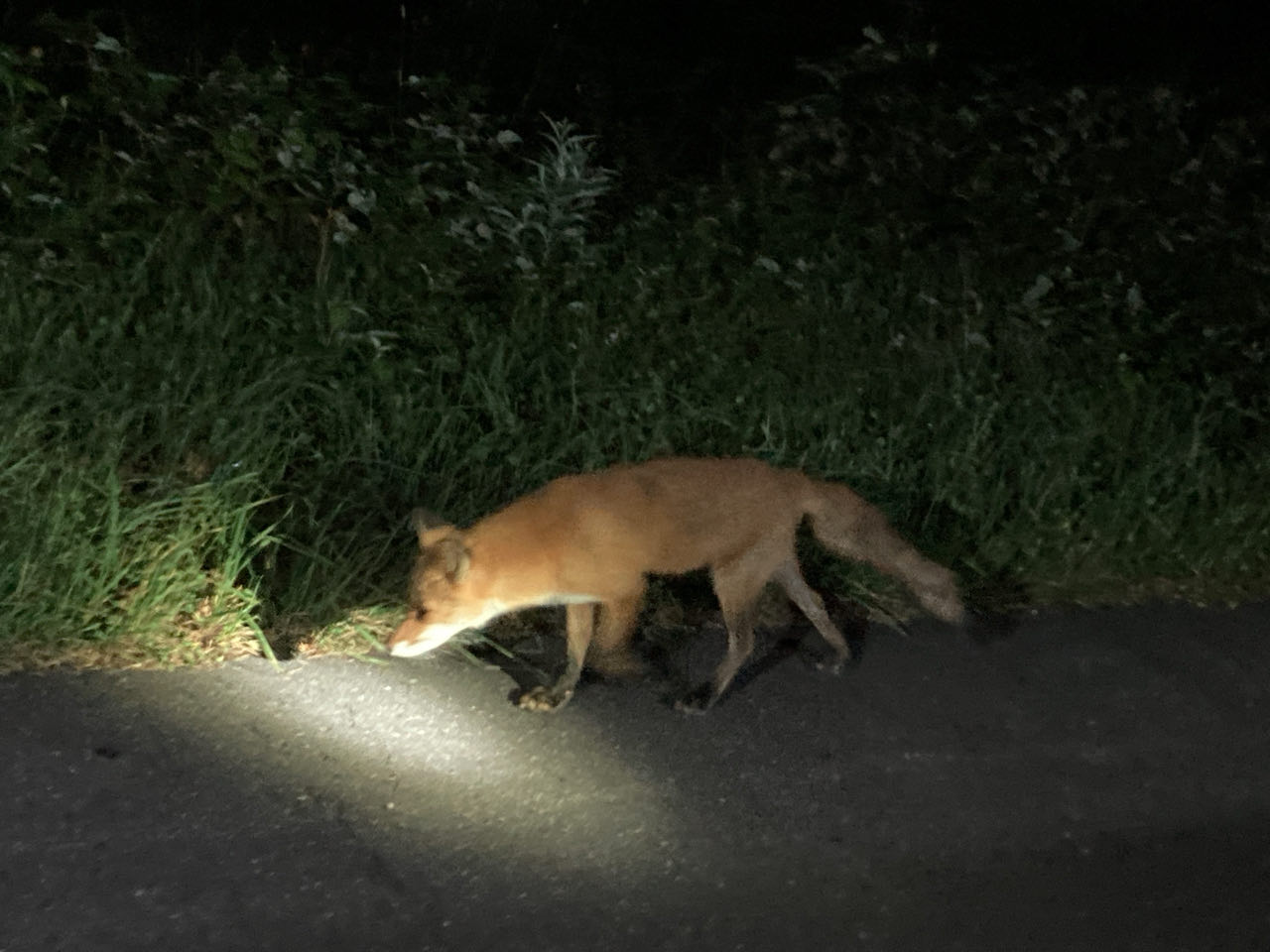 ‘s Avonds, van 19.30 tot 21.30 uur, sluit ik me aan bij een Wildlife Night Drive met een bedrijf genaamd Picchio. In een minibusje, uitgerust met verrekijkers en schijnwerpers, rijden we langzaam over de wegen rond het natuurcentrum en de toegang tot Five Lakes op zoek naar dieren. We vinden al snel een jong hert (ook in het Japans een ‘Bambi’) en later een vos.