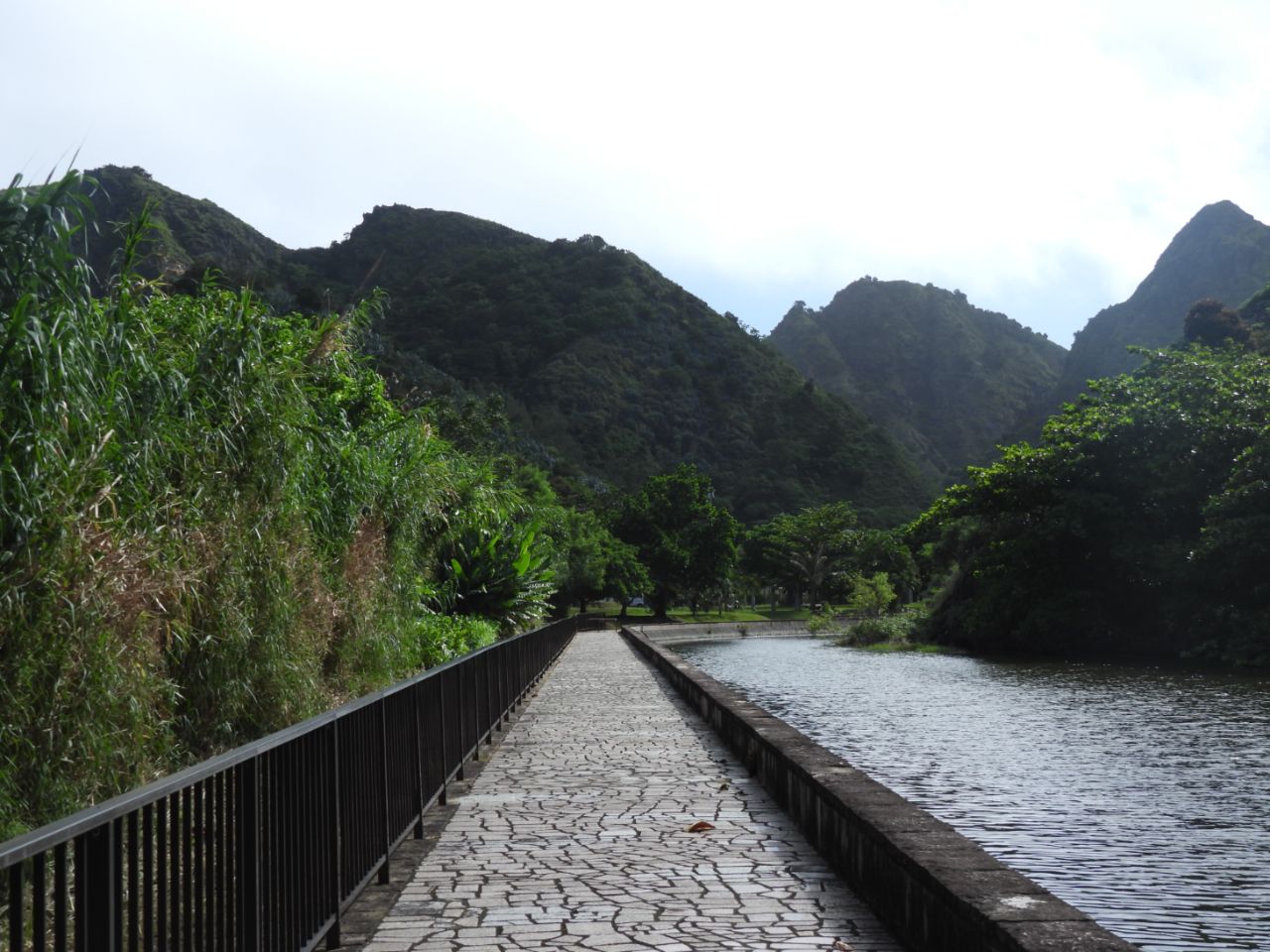 Als de boottocht afgelopen is, heb ik mijn doel van de dag al bereikt! Ik had wel een plan B voor het geval ik geen boot had kunnen vinden: je kunt over de hoofdbrug van Ohara lopen en dan de weg naar links volgen. Het eindigt bij een natuurpad en observatieplatform met uitzicht op het bos en de rivier. Maar ik houd het bij een picknick onder de brug en maak foto’s van een stenen versie van de Iriomote Wild Cat, voordat ik om 3 uur de veerboot terug naar Ishigaki neem.