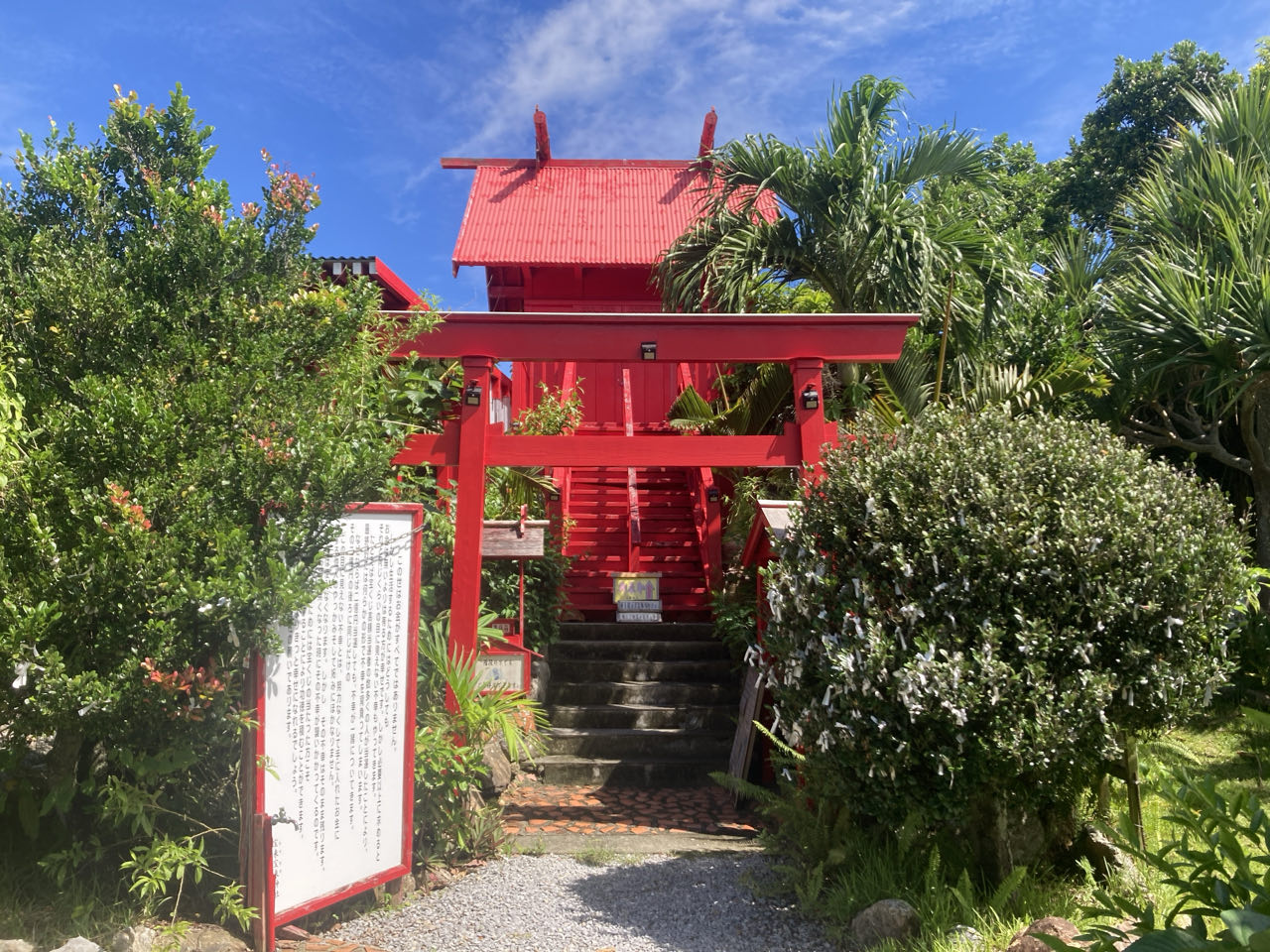 Met de lichtere bepakking ben ik klaar voor een wandeling van een half uur de stad uit, het platteland op voor het Ishigaki Hogihogi Shrine. Het is nog steeds erg heet en vooral op het laatste gedeelte is er weinig schaduw. Het heiligdom is maar klein, maar zit met een blauwe toegangspoort en een felrood hoofdgebouw strak in de verf. Er is zelfs nog een andere bezoeker, die met een scooter is gekomen. Je kunt hier bidden voor voorspoed.