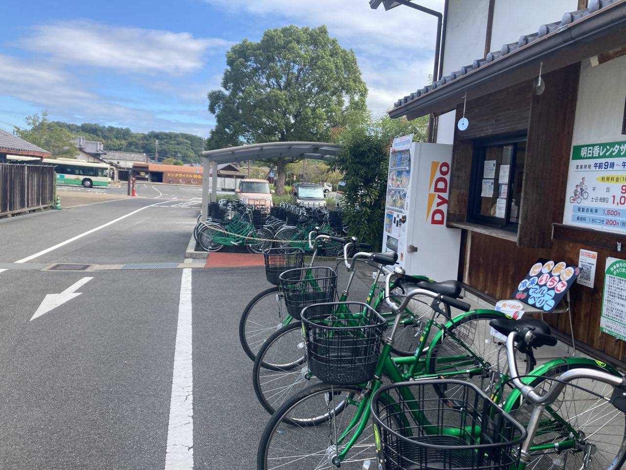 In Asuka liggen de resten van wat Japan’s eerste hoofdstad was. Ze liggen nu verspreid over het platteland rond het station van Asuka, dus een fiets is het beste vervoermiddel om een aantal opgravingen te gaan zien. Gelukkig zijn ze hier helemaal op ingesteld: vrijwel naast het station is een fietsenverhuur. Ik ben er iets voor negen uur, en de uitbaatster is net de fietsen aan het buiten zetten. Ik kan er al wel eentje huren: ze hebben gewone en elektrische fietsen. Ik neem de laatste, voor slechts 500 yen (3 EUR) meer. Voor 1500 yen in totaal mag ik de hele dag op pad met de fiets, je hoeft ook geen borg of zo achter te laten.
