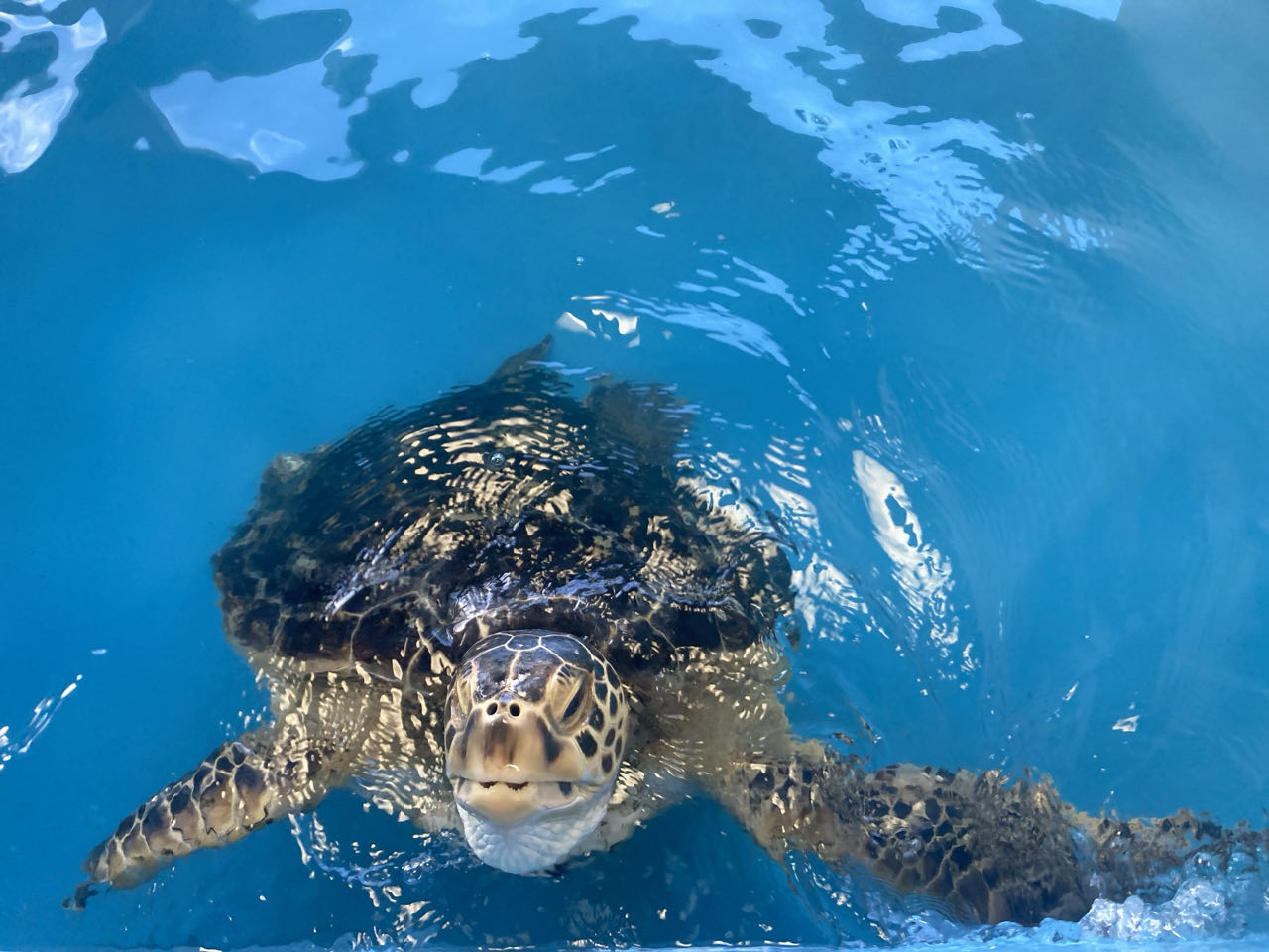 Maar ook om 9 uur gebeurt er niet veel. Er blijkt een bordje te hangen (alleen in het Japans natuurlijk) dat ze aan het verbouwen zijn, maar dat je vrij naar achteren mag lopen om de schildpaddden in hun baden te zien. Ze houden hier groene en lederschildpadden, om te herstellen of te kweken. Er staan self-service bakjes bij, waar je voor 100 yen een paar blaadjes sla mag pakken om hen een snack te geven.
