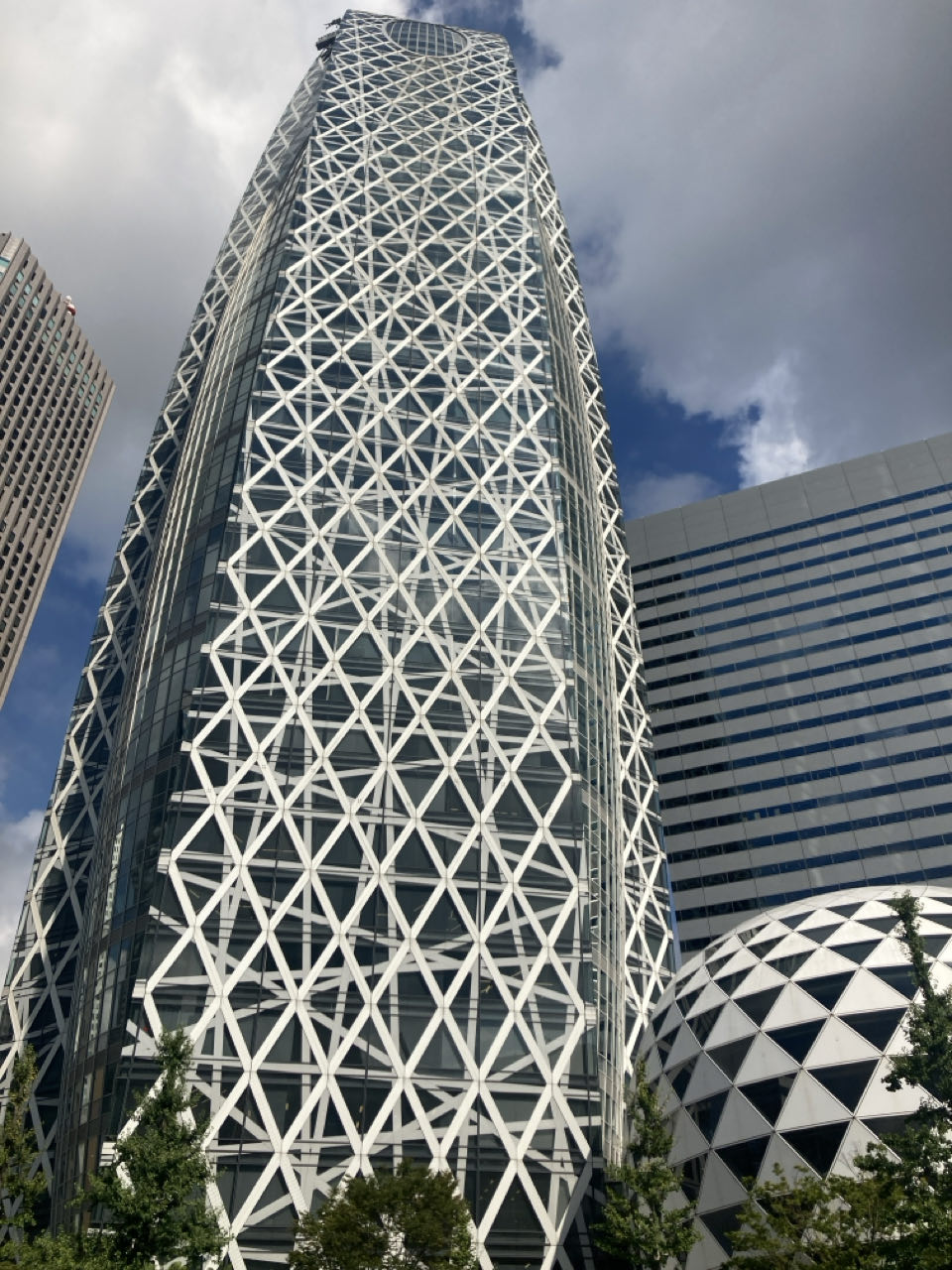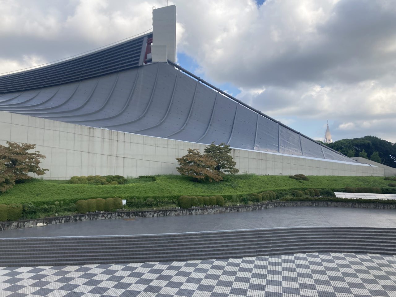 Ik begin bij het Yoyogi Stadion. Het is gebouwd voor de Olympische Spelen van 1964. Het is nog steeds in gebruik als sporthal. Je kunt vrij op het terrein rondlopen en ik zie heel wat jongeren in een rij zitten, naar ik aanneem te wachten op het vrijkomen van kaartjes voor een concert. Tange mengde modern-westerse en traditioneel Japanse invloeden. Het meest opvallend is het ‘hangende’ dak, als een soort laken gedrapeerd. Naast de grote hal staat nog een kleinere versie ervan, die ik eigenlijk mooier vind.